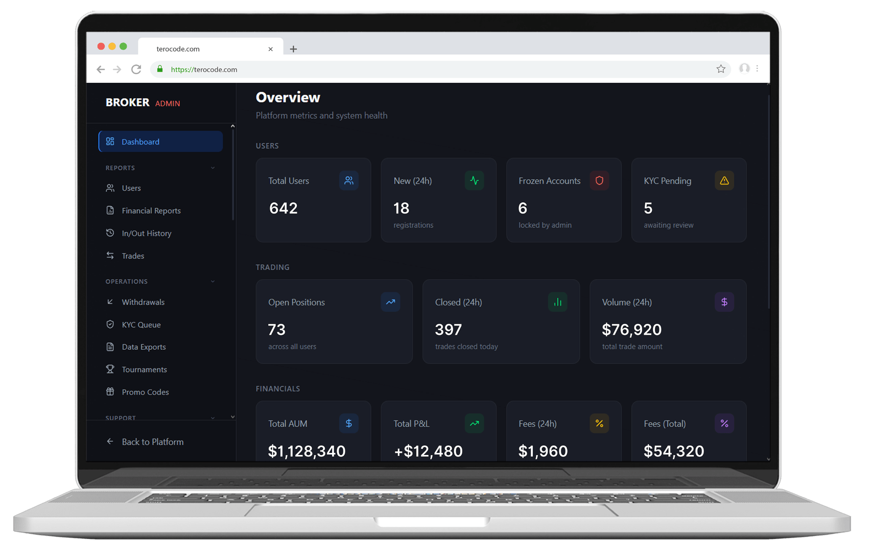 TEROCODE объединяет все ключевые компоненты брокерской инфраструктуры в единую экосистему — от торговой платформы и CRM до платежных решений, собственной ликвидности и инструментов управления рисками, обеспечивая стабильную работу брокерского бизнеса и полный контроль над всеми операционными процессами.